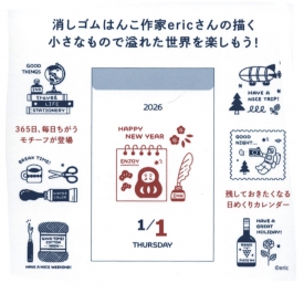 大人気消しゴムはんこ作家「eric」さんの描くモチーフが毎日登場する日めくりカレンダーです。懐かしさを感じさせる作風に日めくりの持つ暖かい雰囲気が相性ぴったりです。