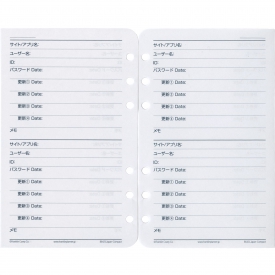 1ページに2種類の ID・パスワードが記入でき、パスワードを更新してもポケットサイズは3回、コンパクト、クラシックサイズは4回まで書き込むことができます。10枚入りです。