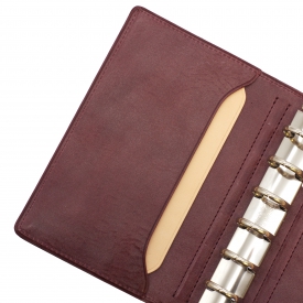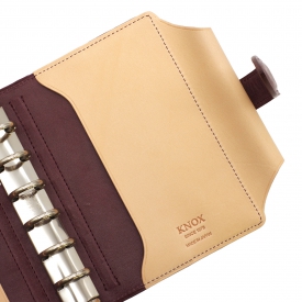 2種類の革を組み合わせたコントラストが特徴的なデザイン。メインの素材にはブランドのクラフトマンシップマインドを印象付ける上品でふっくら柔らかな質感のホワイトワックスシュリンクレザー、ハードな使用シーンにも耐えてほしいペンホルダーやポケット部分には丈夫で使う人とともに育ち革らしいエイジングで応えるナチュラルタンレザーを配置。ともに使い込むほどに美しい艶と深みのある色合いに変化するフルベジタブルタンニン鞣しレザーならではの世界観を存分に楽しめます。