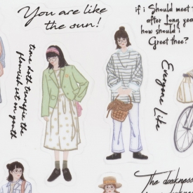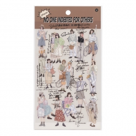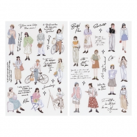 おしゃれに着飾った女の子と格好良い英字のシールです。PET素材なので透け感があり重ねて貼ることができます。