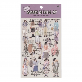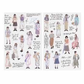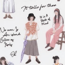 おしゃれに着飾った女の子と格好良い英字のシールです。PET素材なので透け感があり重ねて貼ることができます。