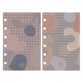 あなたの秘密を守ってくれる「シークレットリフィル」。クリアファイルのようにリフィルを挟み込んで見えないように保管できます。表面には切れ目が入っているので金具を開けずに、開いたり閉じたりできます。ノートがテーマのデザインです。罫線と方眼の上に描かれたアシメトリーのシェイプデザイン。霞んだダスティーカラーがポイントです。