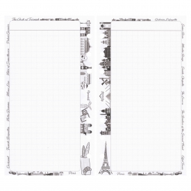 5.5x5.5mmの方眼メモを縁取るようにランドマークや街並みのイラストが入ったリフィルです。最上部には題名を書けるタイトル欄もあります。裏表異なるデザインなので見開きにすると違うデザインが並びます。30枚入。