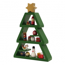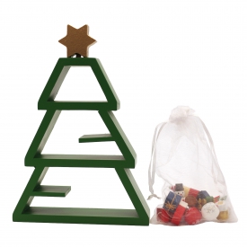 小さな棚の形をした、木製のクリスマスツリーです。13個のミニオーナメントを自由に飾りつけてデコレートできます。