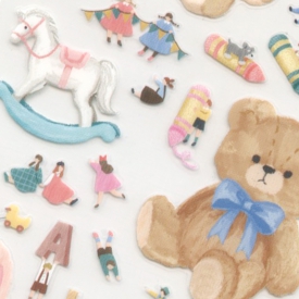 日常生活に紛れたこびとたちの様子を描いたPET素材のシールです。大きなモチーフピースとこびとピースを組み合わせて使うことで、物語性のあるデコレーションを楽しむことができます。