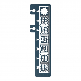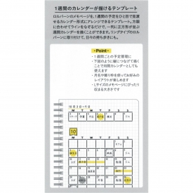 薄手のステンレス素材で横に1週間のカレンダーが描けるロルバーン専用のテンプレートです。予定管理やライフログに機能と楽しさをプラスするアクセサリーです。飾り罫と月や曜日のアルファベットを使って1週間のカレンダーを作成できます。2段目、3段目と続けて描くと1ヵ月のカレンダーも作成でき、ギザギザの丸いマークは目立たせたい予定の上から描きこめます。横幅が約11cmのカレンダーでロルバーン ポケット付メモのLサイズにちょうどいいサイズです。本体の二か所の穴をリングタイプのロルバーンポケット付メモなどのリングに着脱可能。