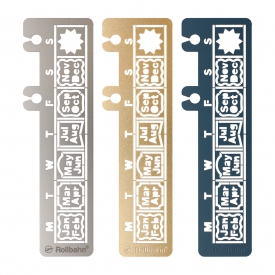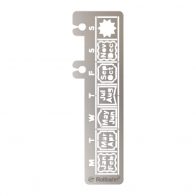 薄手のステンレス素材で横に1週間のカレンダーが描けるロルバーン専用のテンプレートです。予定管理やライフログに機能と楽しさをプラスするアクセサリーです。飾り罫と月や曜日のアルファベットを使って1週間のカレンダーを作成できます。2段目、3段目と続けて描くと1ヵ月のカレンダーも作成でき、ギザギザの丸いマークは目立たせたい予定の上から描きこめます。横幅が約11cmのカレンダーでロルバーン ポケット付メモのLサイズにちょうどいいサイズです。本体の二か所の穴をリングタイプのロルバーンポケット付メモなどのリングに着脱可能。
