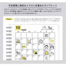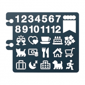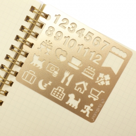 薄手のステンレス素材で作られた、予定を彩るイラストが描けるロルバーン専用のテンプレートです。誕生日や旅行、食事といったイベントアイコンや、ネコや花束のマークはロルバーンダイアリーのマンスリーページに収まるサイズです。