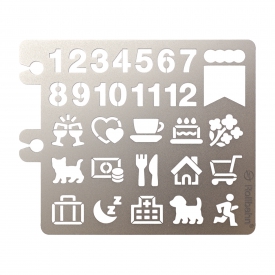 薄手のステンレス素材で作られた、予定を彩るイラストが描けるロルバーン専用のテンプレートです。誕生日や旅行、食事といったイベントアイコンや、ネコや花束のマークはロルバーンダイアリーのマンスリーページに収まるサイズです。