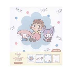 おそろいの服を着たサンリオキャラクターたちとペコちゃんが大集合したメモブロックです。ペコちゃんと同じ表情をまねっこしている姿がとってもキュート。仲良しな雰囲気と特別感あふれるデザインで見ているだけで笑顔になれるコラボです。4柄×25枚入ったたっぷりつかえるメモ帳です。