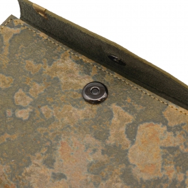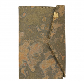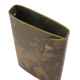 革の表面に鉄、真鍮、赤銅の金属粉を吹き付けて、錆を呼び起こして味を出したエイジングレザーです。仕上げにコーティング処理されるので金属粉が脱落したり大きく錆が進行する心配はありません。