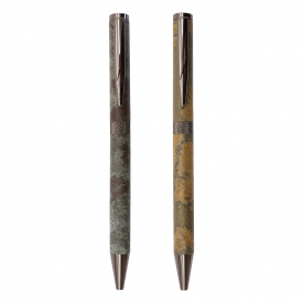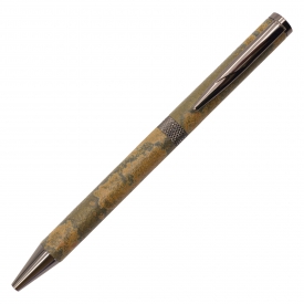 革職人の経験と感性を頼りにして一枚一枚金属粉を吹き付けて丁寧に仕上げられる、工芸品の様な特別な革・錆エイジングレザーを、ツイスト式ボールペンに巻き付けました。