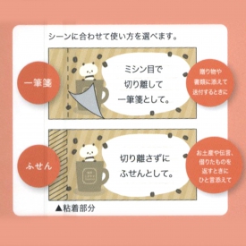 イラストレーターmizutamaさんと、雑貨ブランド「UN TROIS CINQ」のコラボレーション商品。左側(のり部分)に入っているミシン目で切り離せば一筆箋としても使えるふせんです。