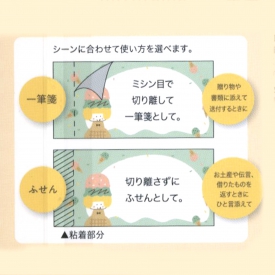 イラストレーターmizutamaさんと、雑貨ブランド「UN TROIS CINQ」のコラボレーション商品。左側(のり部分)に入っているミシン目で切り離せば一筆箋としても使えるふせんです。