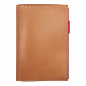 可動式ペンホルダーが付属したノートタイプのシステム手帳です。表側には純粋なアニリン水性染料仕上げを施すレーデルオガワ製のコードバンを使用し、内側にはイタリア・ヴィルジリオ社製のスクラッチ加工が特徴の植物タンニン鞣し革・マルゴーを使用しています。染料染めの色味の深さと独特な光沢があり少しづつ色艶を増す経年変色が楽しめます。リングは安定のクラウゼ製。