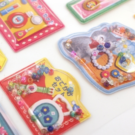 昭和レトロなおもちゃがテーマのカプセルシールです。カプセル部分を透明パッケージに見立てることで、ちょっとしたリアル感を表現しています。ビーズの入っていないピースもカプセル素材です。ミニチュアサイズのおもちゃ風デザインを楽しめます。
