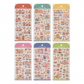 仲良しの動物6匹組が織りなす、日常の小さなドラマを切り取ったシールです。ぽてぽてしたフォルムと子供らしいユーモラスな表情は手帳やカードに貼るだけで癒しを添えてくれます。
