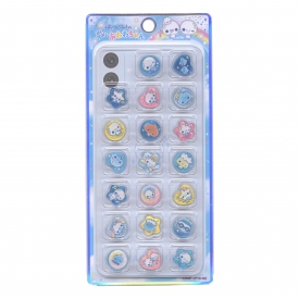 丸、星、ハートのコロンとした立体おはじきシールです。全部違う柄が各5柄ずつ。キラキラホログラムでかわいい。スマホケースみたいなブリスターパッケージに一個一個仕切られて入っています。取り出すときはブリスターをスライドして使いたいパーツを選べます。