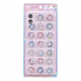 丸、星、ハートのコロンとした立体おはじきシールです。全部違う柄が各5柄ずつ。キラキラホログラムでかわいい。スマホケースみたいなブリスターパッケージに一個一個仕切られて入っています。取り出すときはブリスターをスライドして使いたいパーツを選べます。