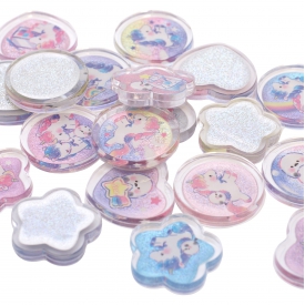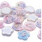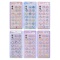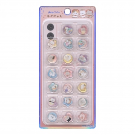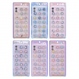 丸、星、ハートのコロンとした立体おはじきシールです。全部違う柄が各5柄ずつ。キラキラホログラムでかわいい。スマホケースみたいなブリスターパッケージに一個一個仕切られて入っています。取り出すときはブリスターをスライドして使いたいパーツを選べます。