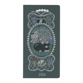 刺繍作家でイラストレーターの奥見伊代さんがデザインした刺繍作品がweeksになりました。「私の物語」と名づけられたweeksのデザインは奥見さんが手で刺繍した作品をプリント。草むらでくつろぐ白いイヌと静かにたたずむ黒いネコを、野の草花や、チョウを模した素朴でかれんなレースの飾り枠が華やかに包みます。表紙は硬めで軽くしなる程度のハードカバー仕様。