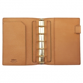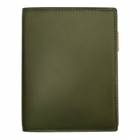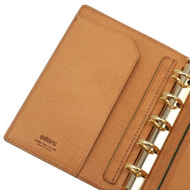 可動式ペンホルダーが付属したノートタイプのミニ5サイズシステム手帳です。表側には純粋なアニリン水性染料仕上げを施すレーデルオガワ製のコードバン、内側にはイタリア・ヴィルジリオ社製のスクラッチ加工が特徴の植物タンニン鞣し革・マルゴーを使用しています。染料染めの色味の深さと独特な光沢があり少しづつ色艶を増す経年変色が楽しめます。リングは安定のクラウゼ製。