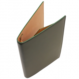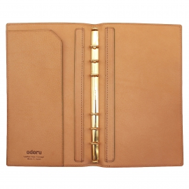 ノートタイプのシンプルなバイブルサイズシステム手帳です。表側には純粋なアニリン水性染料仕上げを施すレーデルオガワ製のコードバンを使用し、内側にはイタリア・ヴィルジリオ社製のスクラッチ加工が特徴の植物タンニン鞣し革・マルゴーを使用しています。染料染めの色味の深さと独特な光沢があり少しづつ色艶を増す経年変色が楽しめます。リングは安定のクラウゼ製。