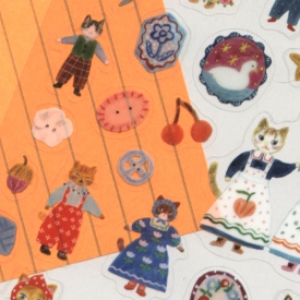 いろんなところに貼りたくなる、布川愛子さんのかわいいシートシールです。思い思いの洋服を着たネコさんと、コロンとしたボタンの組み合わせがかわいくておしゃれです。シートはA5サイズのノートにちょうど挟めるサイズ。大きめのシールは小物のワンポイントやステッカーのように、小さいシールは手帳などに貼ってお楽しみいただけます。
