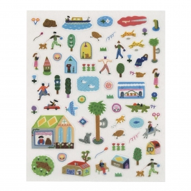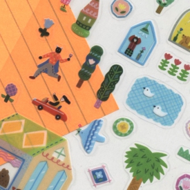 イラストレーター・鈴木なるみさんのシートシールです。ちょっと上の視点から、俯瞰で カラフルに とある街なかの風景が描かれています。窓から知らない街をのぞいているみたいで、なんだかわくわく。ユーモアたっぷりのかわいいシールです。シートはA5サイズのノートにちょうど挟めるサイズ。大きめのシールは小物のワンポイントやステッカーのように、小さいシールは手帳などに貼ってお楽しみいただけます。