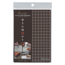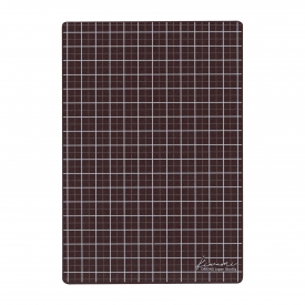 紙に対して滑り止め効果のある、特殊加工のPVC再生マット生地を使用。表面は文字の中心や位置どりがしやすい方眼タイプのブラウン、裏面はゴールドの箔押しロゴがワンポイントの無地タイプのキャメルです。