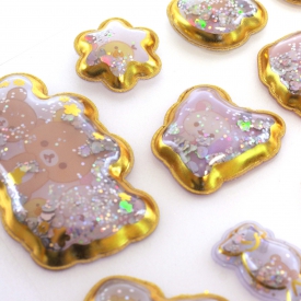 サンエックスの大人気キャラクター「すみっコぐらし」のエアシールです。透明カプセルの中にキラキラのグリッタ―が入り、金箔の縁がついたゴージャスなシール。