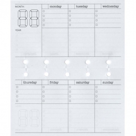 週間横向きリフィル。特徴的なデジタル文字の上下に月名と年数を記入出来るスペースが設けられています。