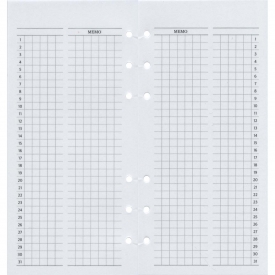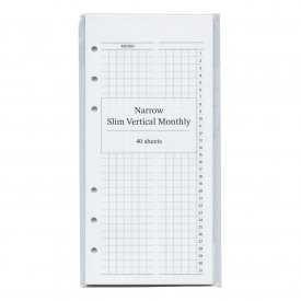 シンプルな月間バーチカルリフィルです。見開きで2ヶ月分の情報が見渡せます。日付入りの横は 5列のマスが並んでいて、少しスペースを空けてメモ欄が設けられています。