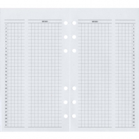 シンプルな月間バーチカルリフィルです。見開きで2ヶ月分の情報が見渡せます。日付入りの横は 5列のマスが並んでいて、少しスペースを空けてメモ欄が設けられています。