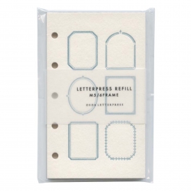 大枝活版室の代表的なモチーフ、フレームデザインのミニ5サイズのシステム手帳用リフィルです。活版印刷が映えるように、一般的な手帳用紙よりも少し厚めの紙です。